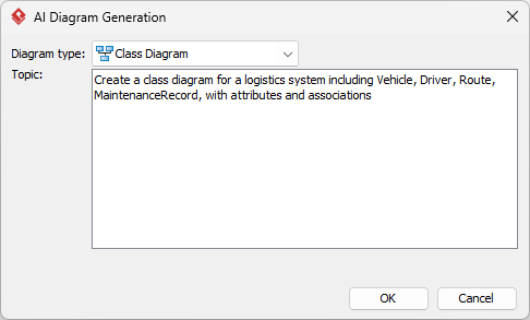 - Input a detailed prompt describing the fleet management entities, such as “Create a class diagram for a logistics system including Vehicle, Driver, Route, MaintenanceRecord, with attributes and associations.”
